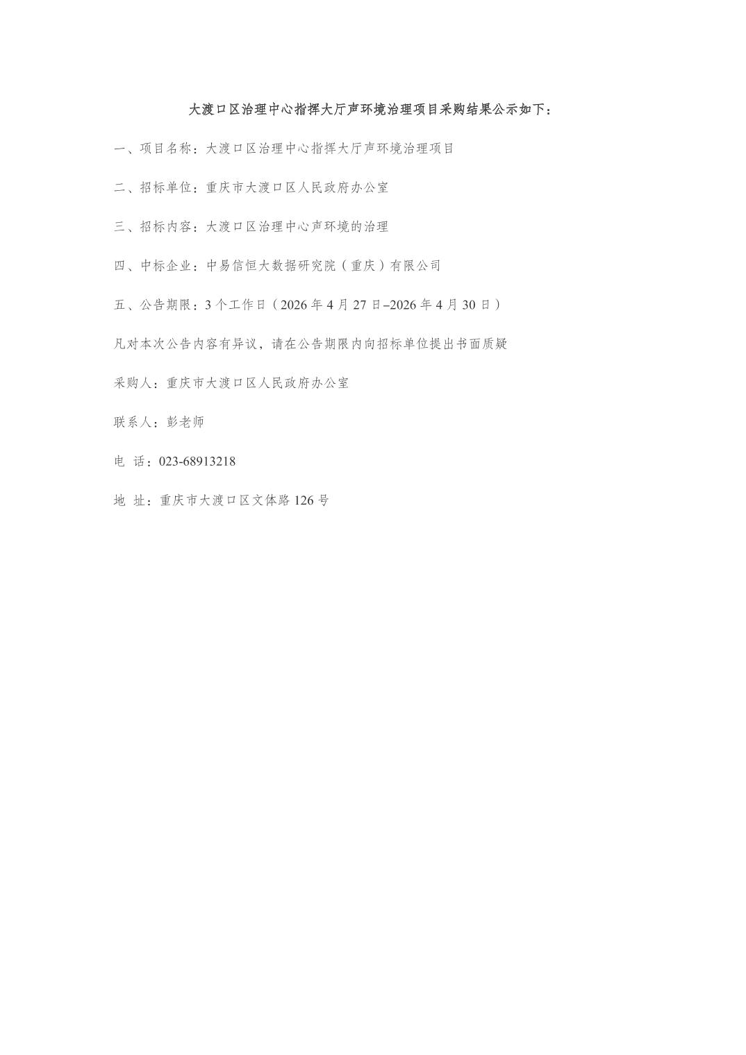 大渡口区治理中心指挥大厅声环境治理项目采购结果公告
