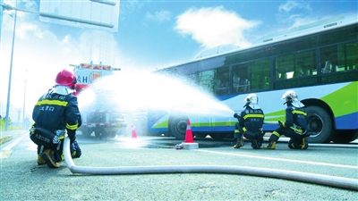 演练内容包括应急救援、调查取证、现场撤除等部分。模拟伏牛溪配送中心成品油罐车执行汽油运输任务时,在五福路与一辆满载乘客的公交车发生碰撞,随后,一辆满载学生的校车又与罐车发生追尾。事故发生后,包括罐车押运员在内的两人受伤被困,罐体内装载的汽油发生泄漏,公交车上几十名乘客和校车上二十余名师生需要紧急疏散。